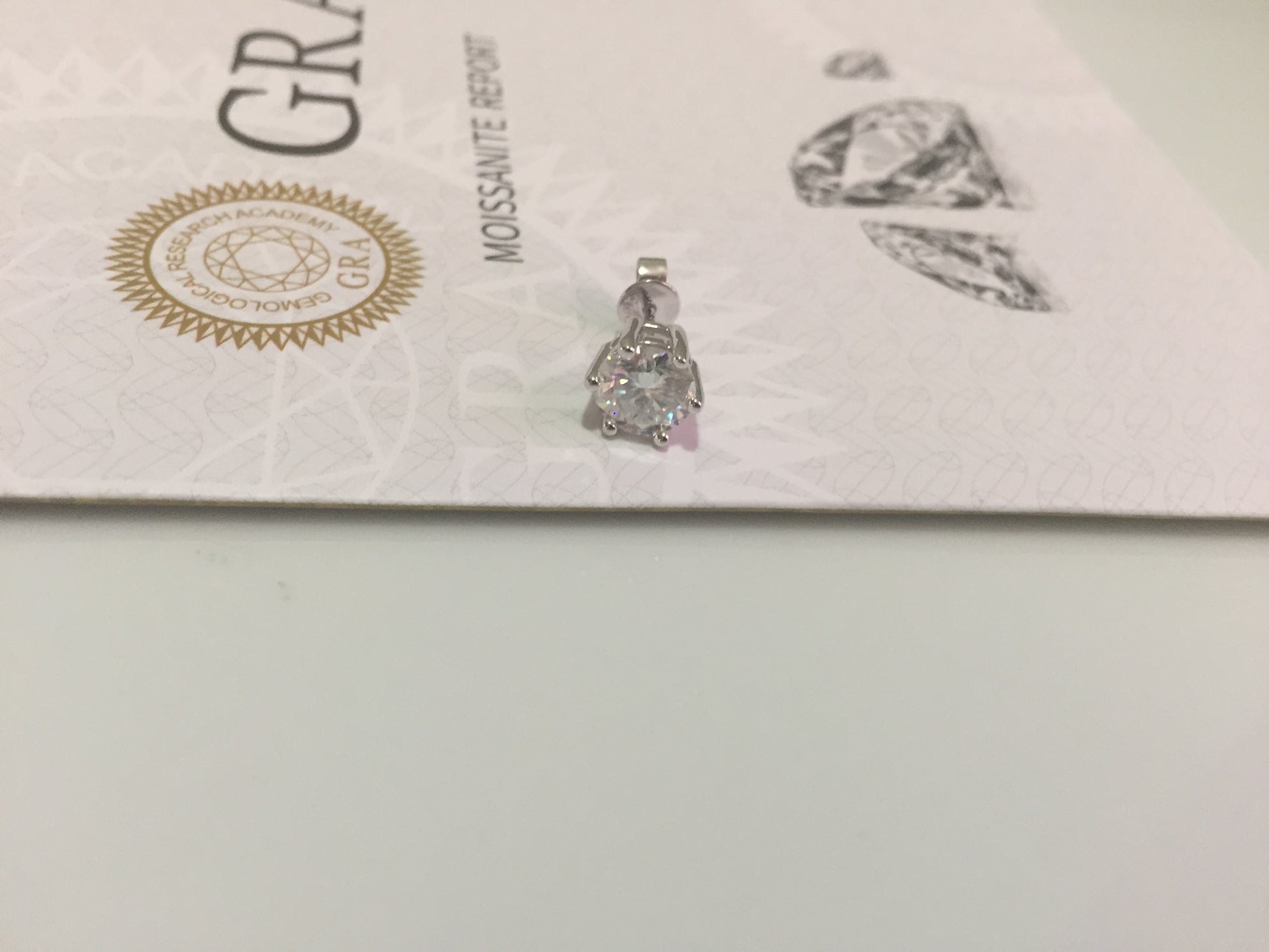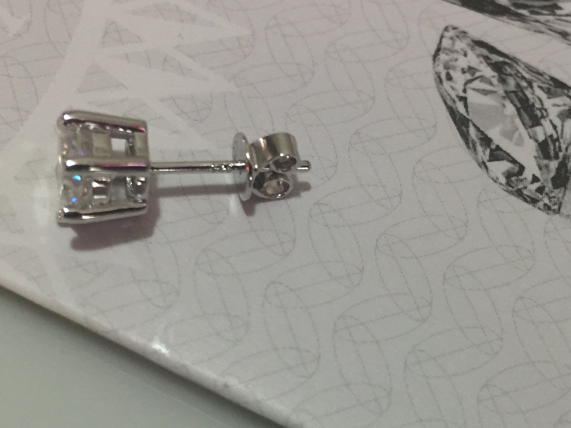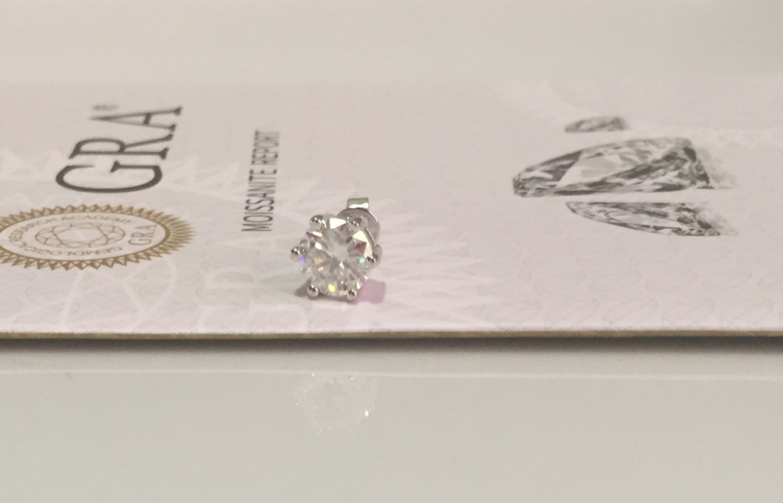 1 single stud earring, 1 carat moissanite stone (6.5mm) set in sterling silver; pushback design with 6 prongs.