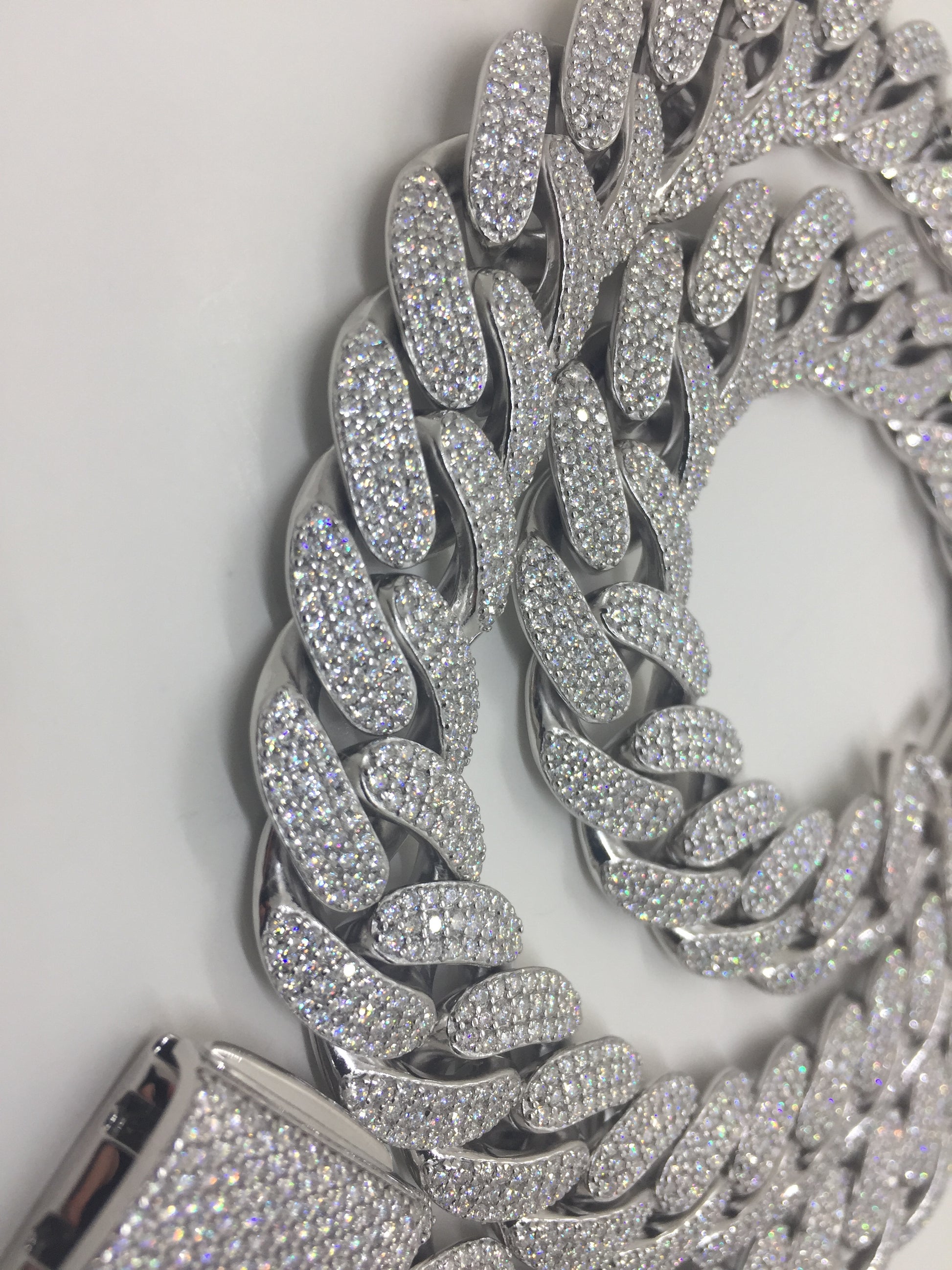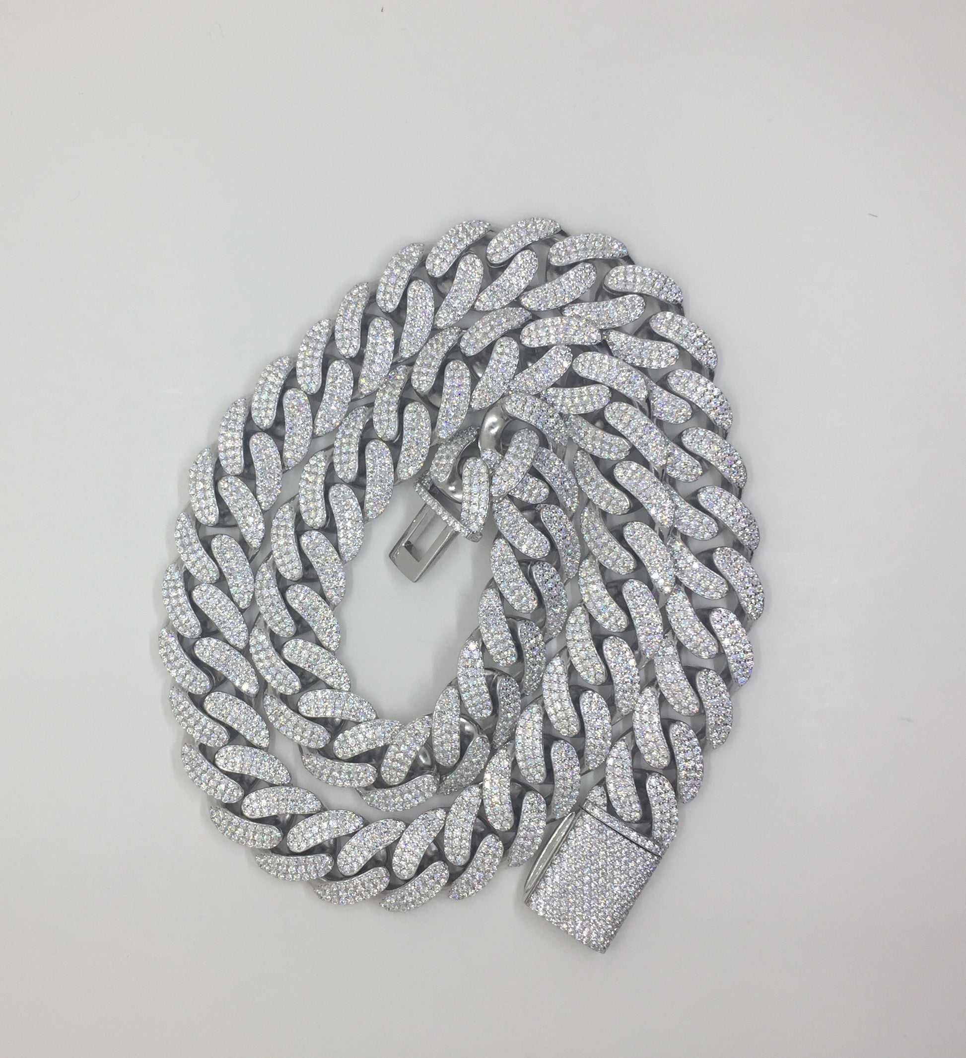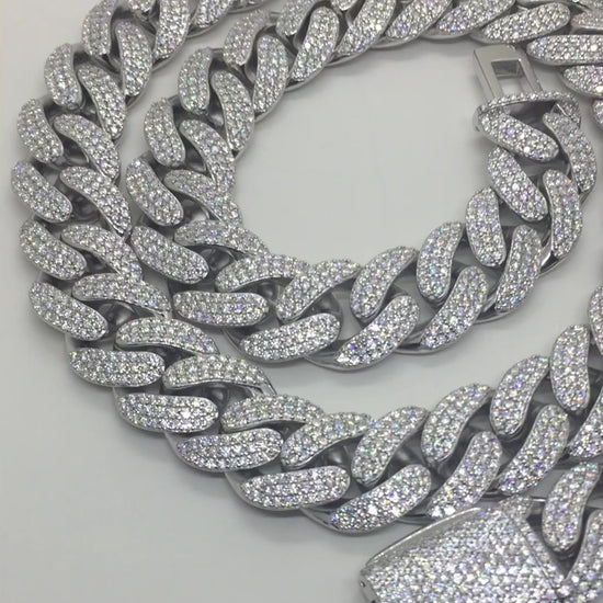 This 16mm Cuban chain style has the classic rounded links, characterized by the Miami Cuban look. 3 rows of moissanite stones are set in each link, for a truly “flooded” look. These chains are in the BIG and HEAVY range, with a solid sterling silver weight and a commanding presence.