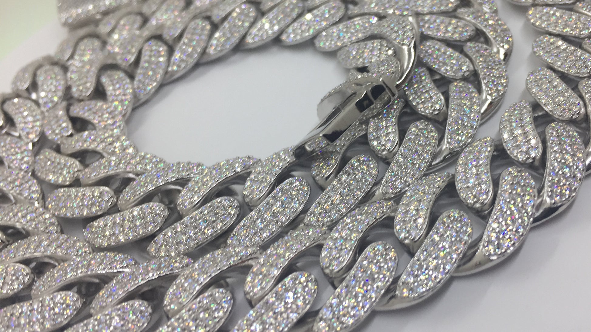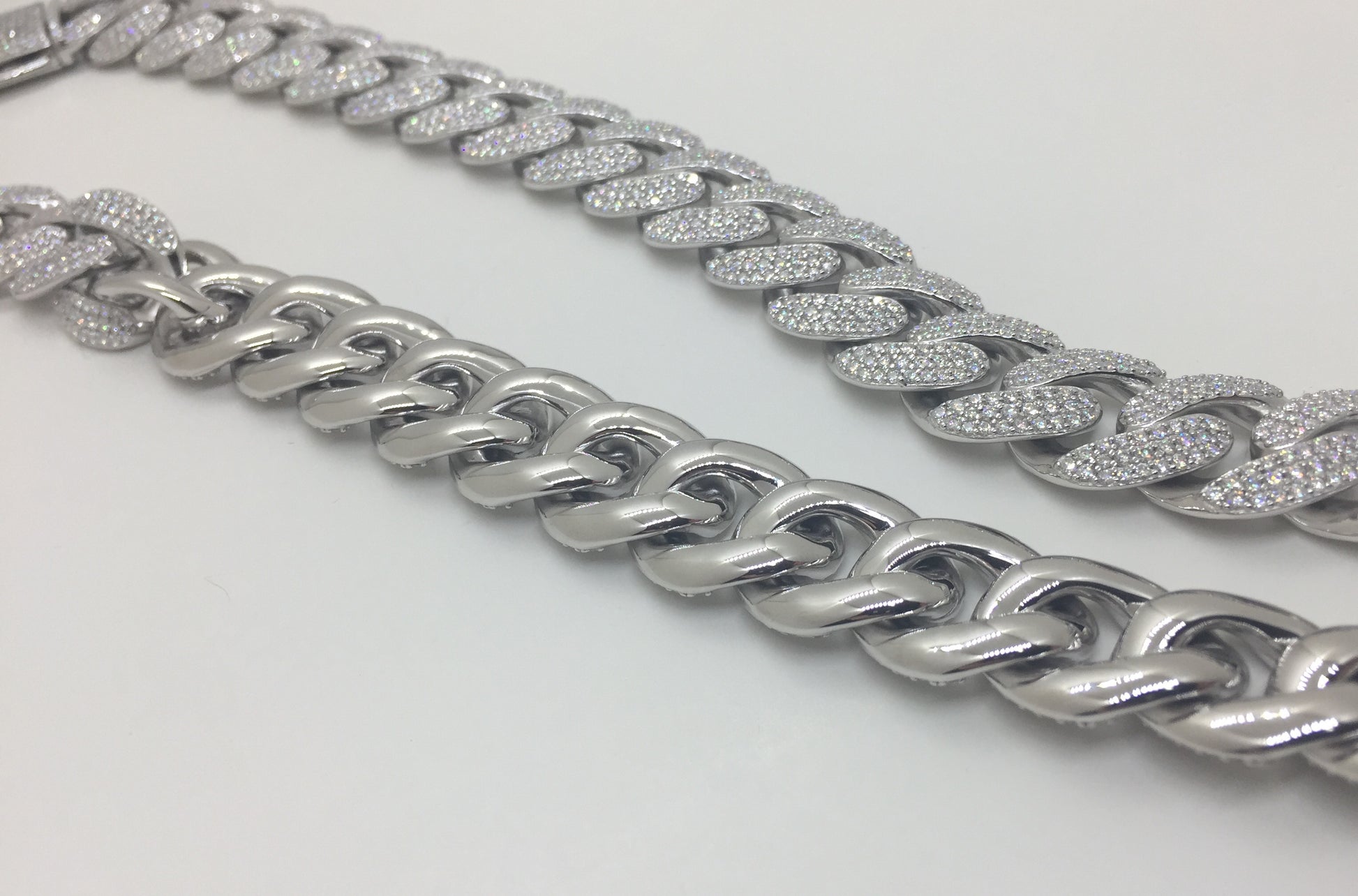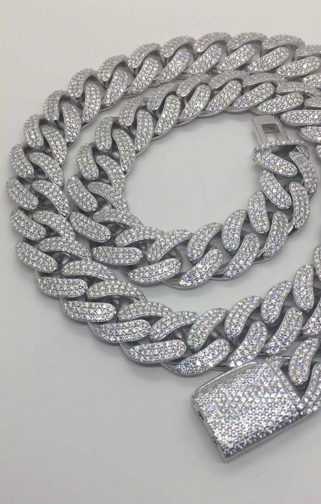 This 16mm Cuban chain style has the classic rounded links, characterized by the Miami Cuban look. 3 rows of moissanite stones are set in each link, for a truly “flooded” look. These chains are in the BIG and HEAVY range, with a solid sterling silver weight and a commanding presence.