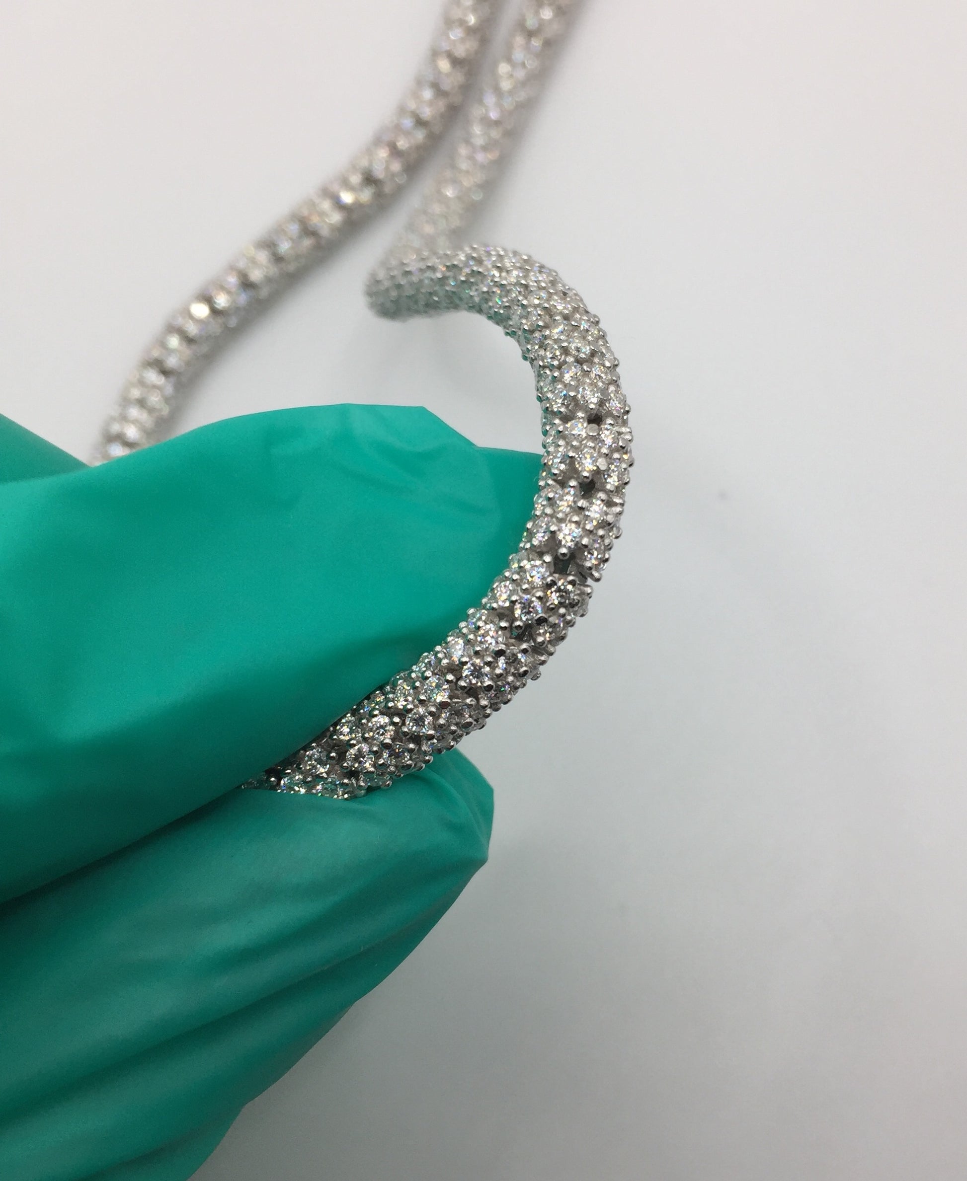 A truly unique and rare design, the “Icy Scales” chain features a design that resembles the scales on a reptile, with a rounded 3D construction. The links are covered with small 1.4mm Moissanite stones, the result —> 360 degrees of shine and sparkle!