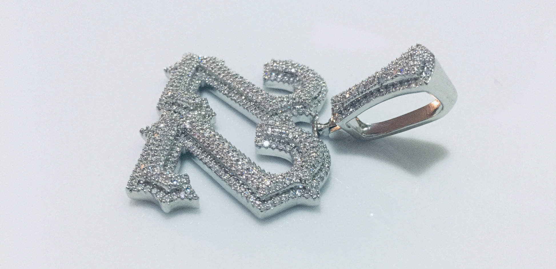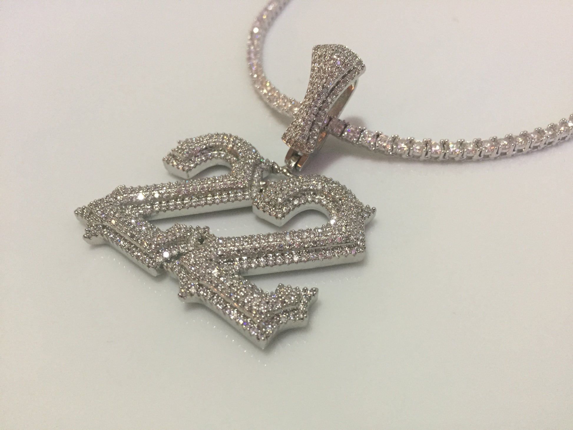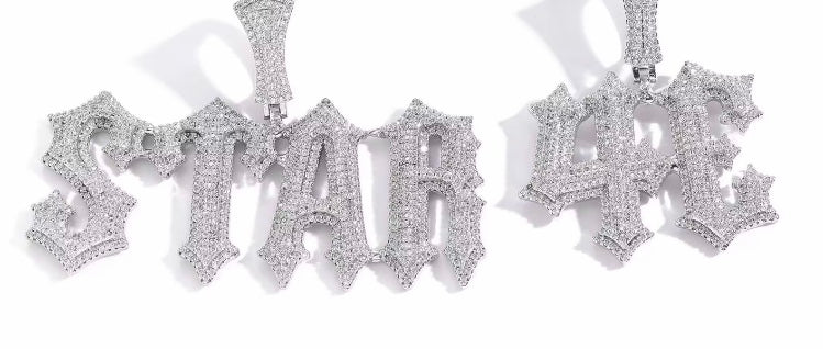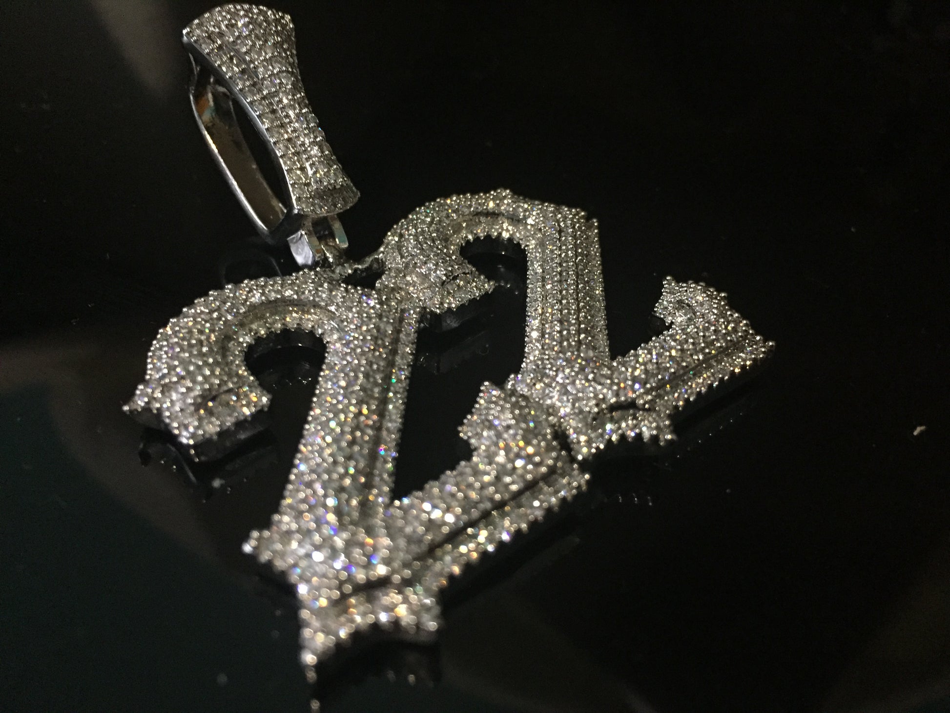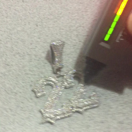 Medium-sized Custom Letter or Number Pendants in a Gothic Script style. These pendants dazzle and shimmer with any light! Flooded with small Moissanite stones, and set in solid sterling silver. Get your own letter/number/name!