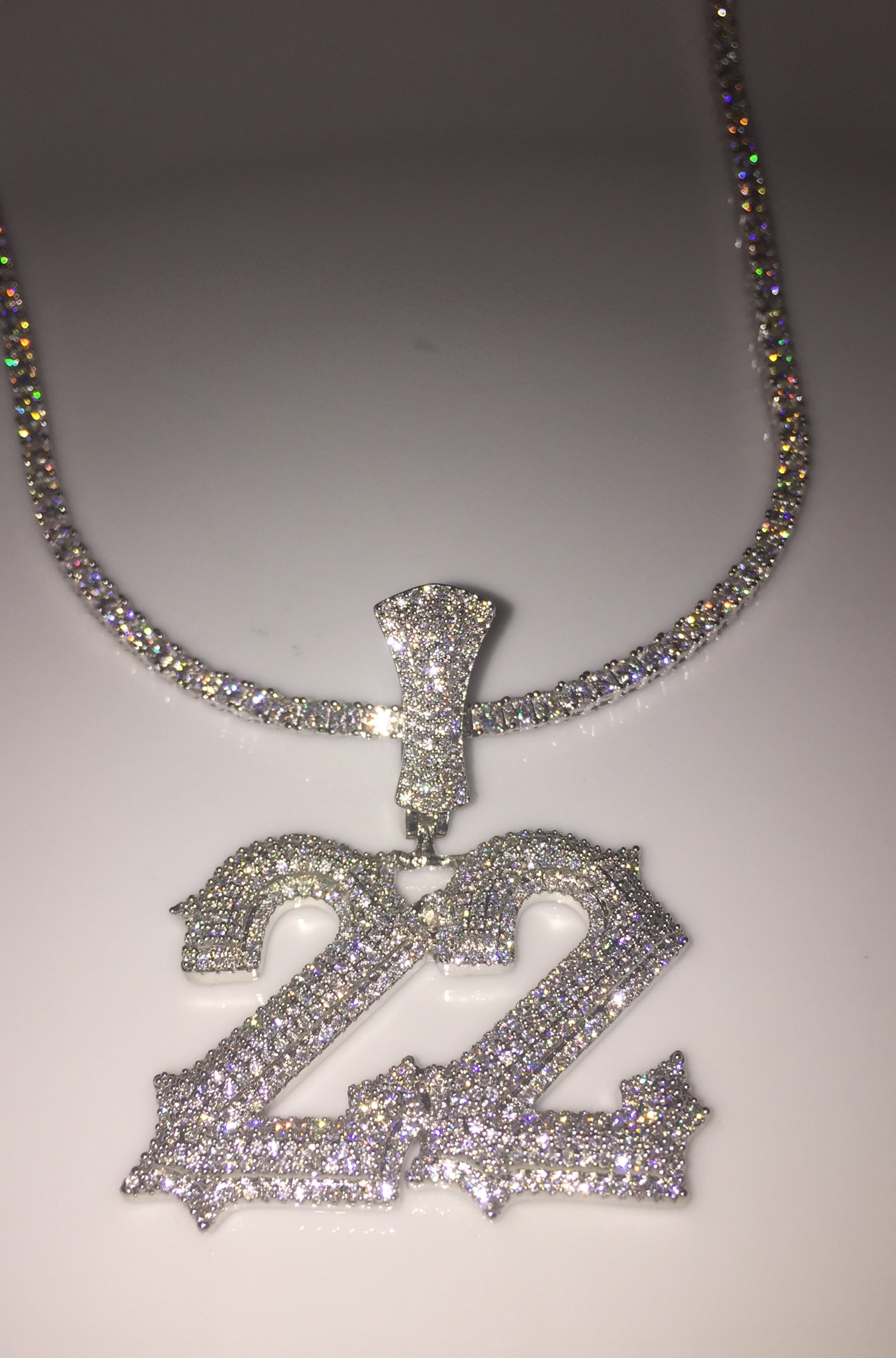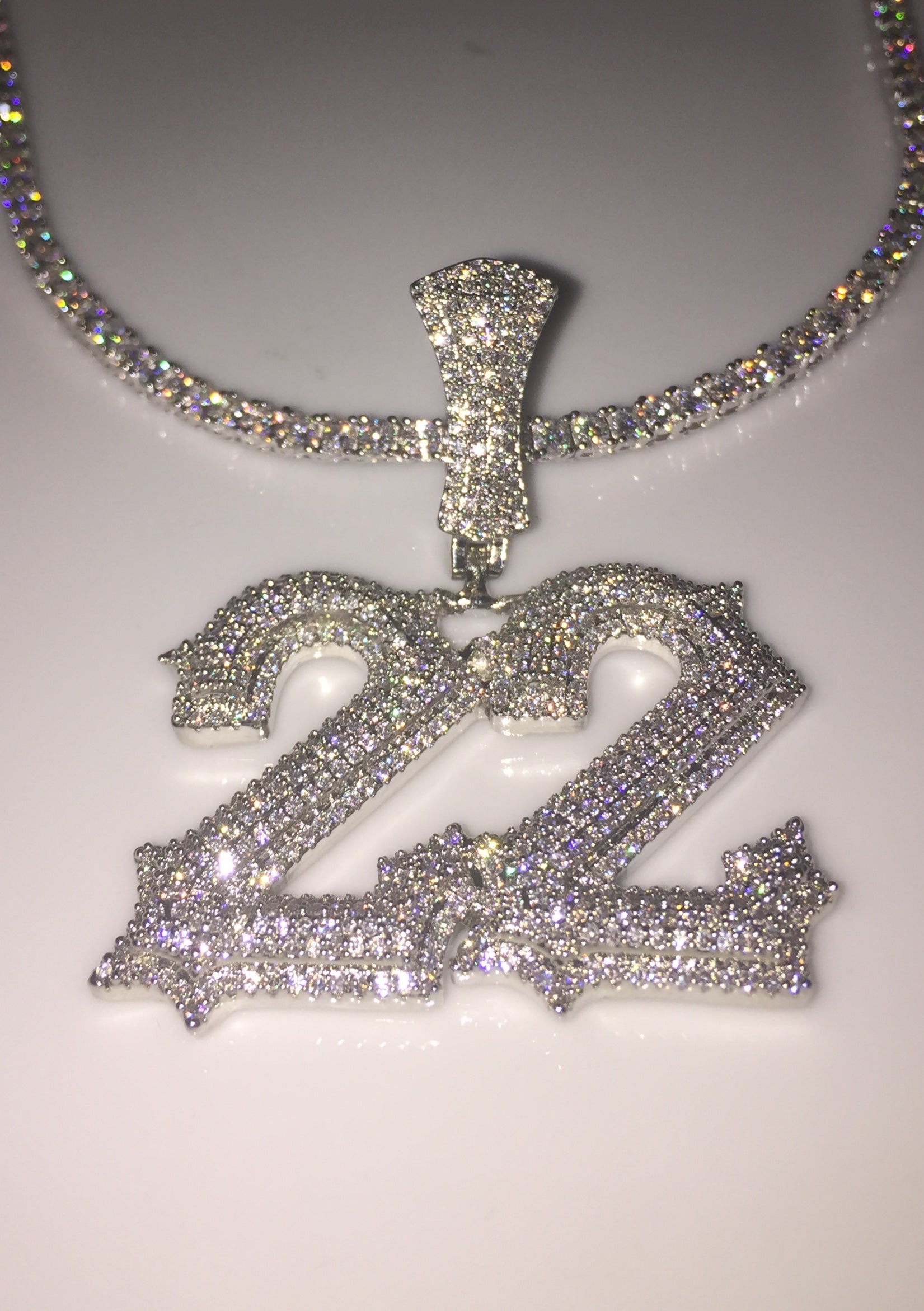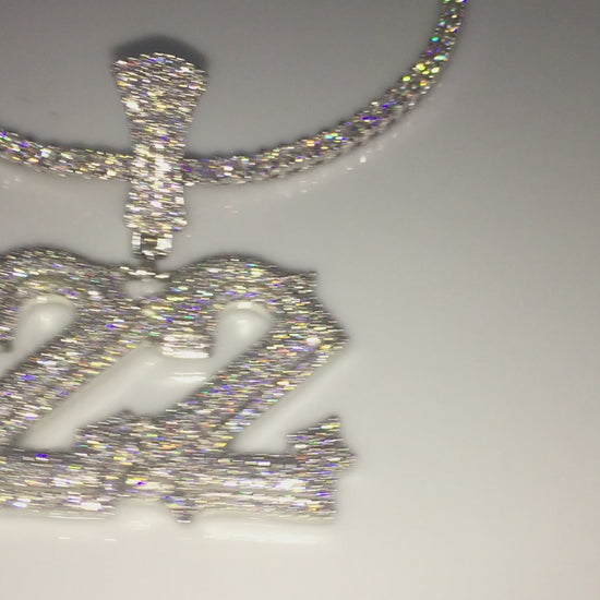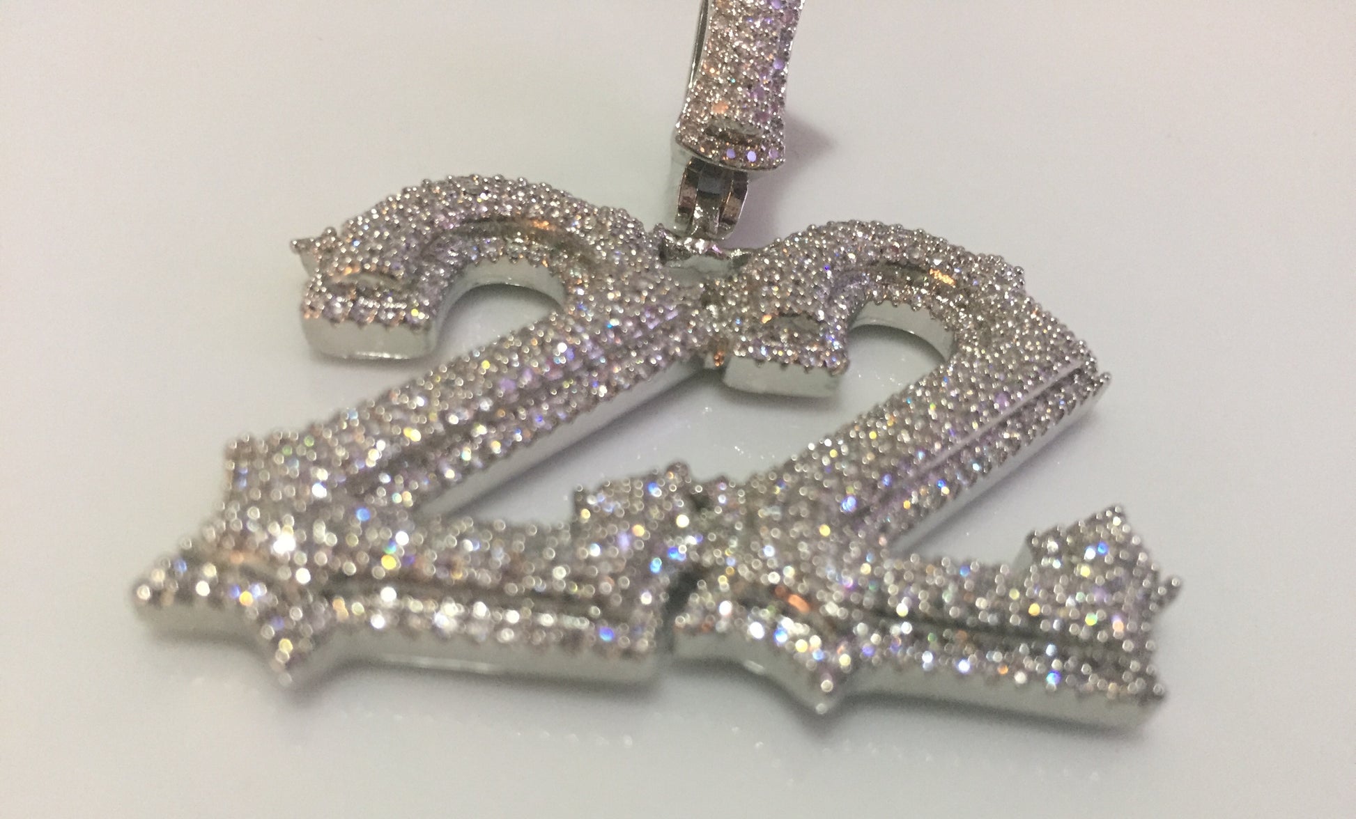 Medium-sized Custom Letter or Number Pendants in a Gothic Script style. These pendants dazzle and shimmer with any light! Flooded with small Moissanite stones, and set in solid sterling silver. Get your own letter/number/name!