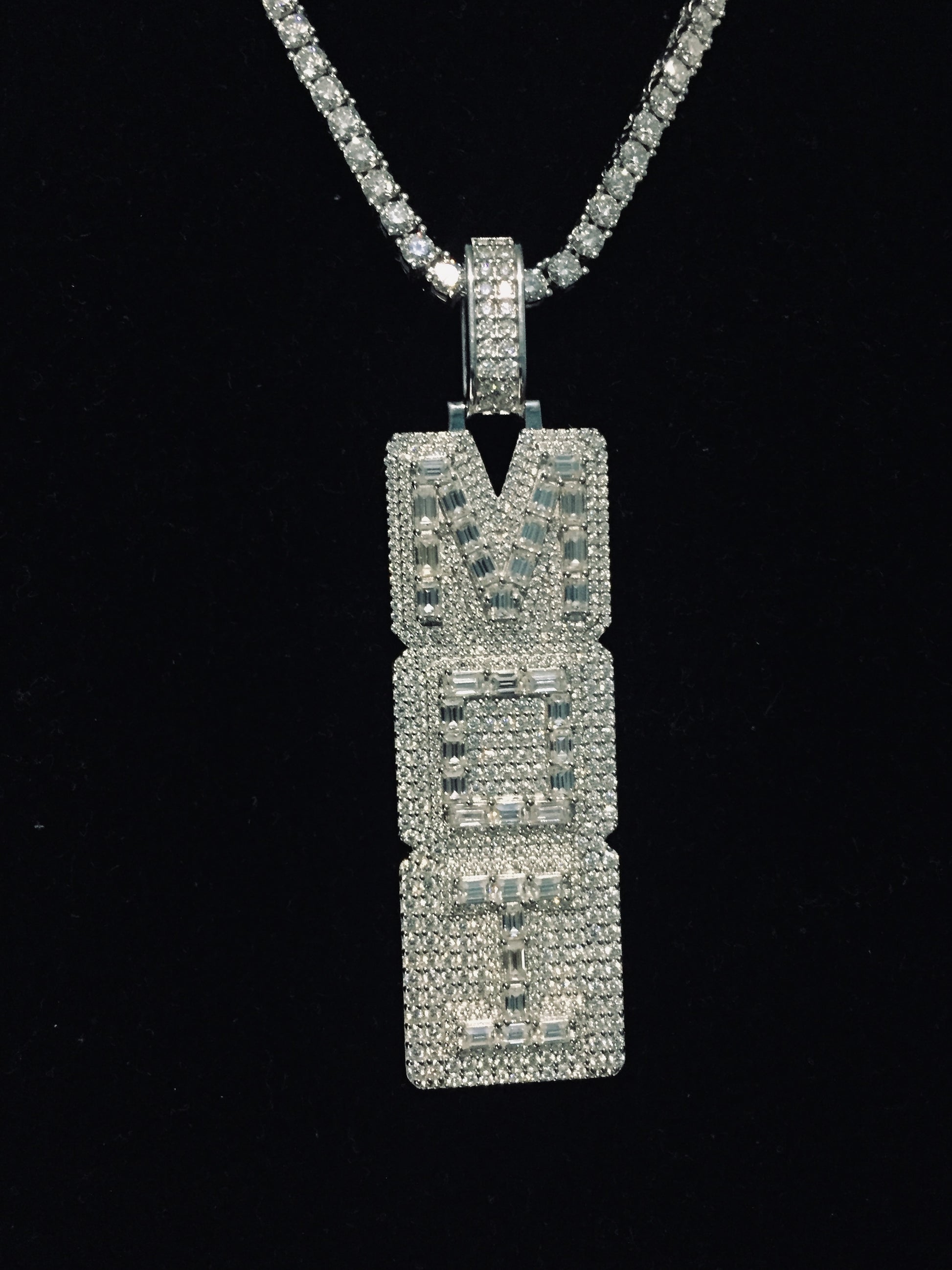These personalized letter pendants feature a square shaped base, flooded with moissanite; inlaid small round stones AND raised baguette stones that shape out each letter. Set in sterling silver. Truly a unique style!