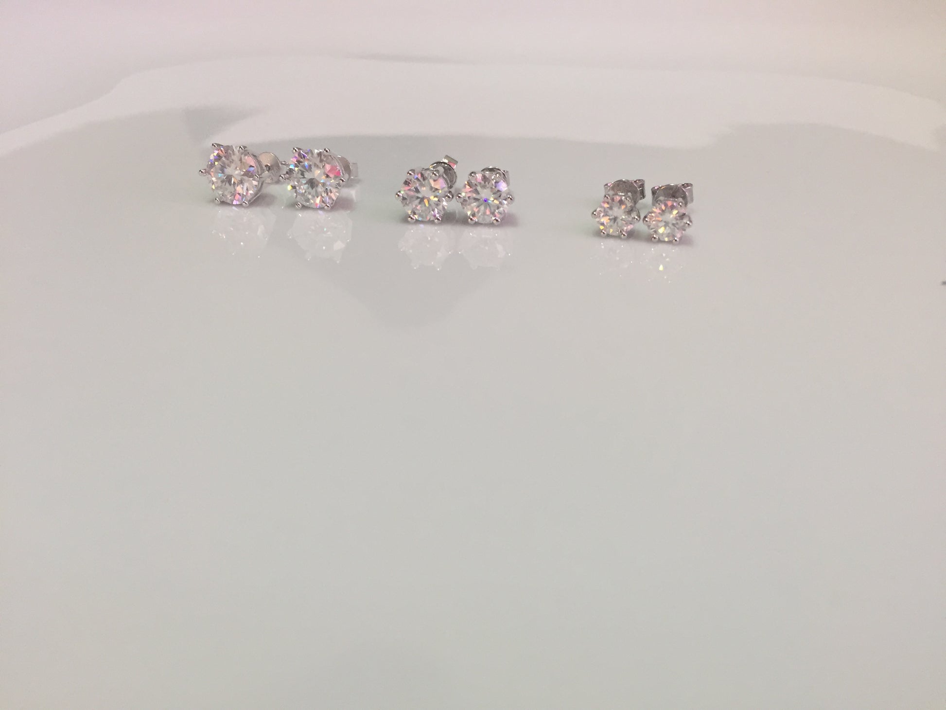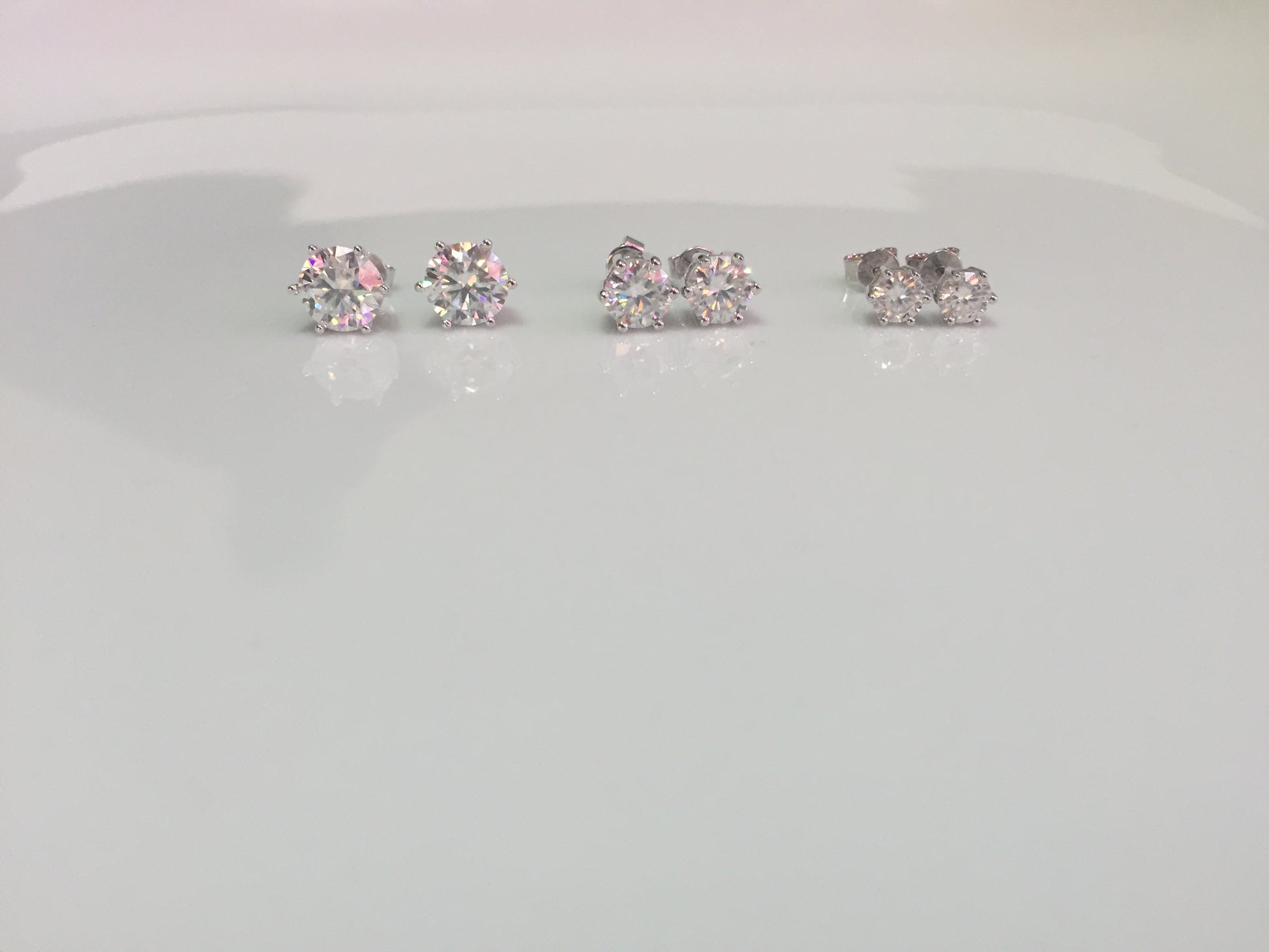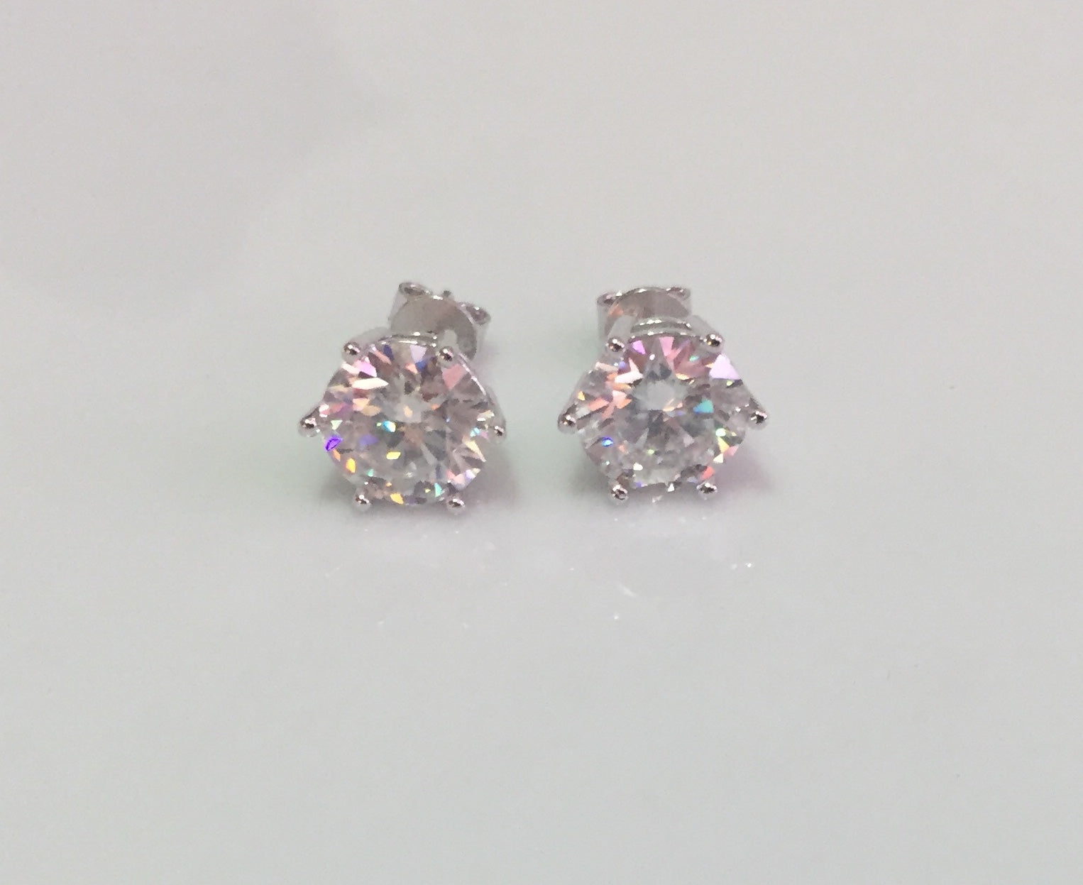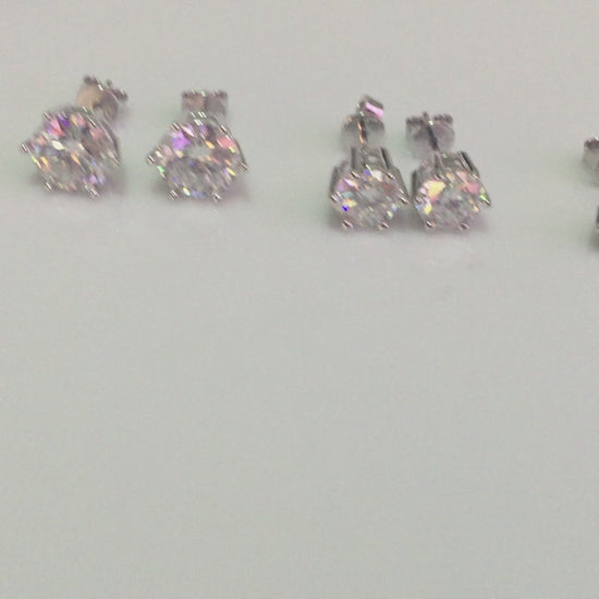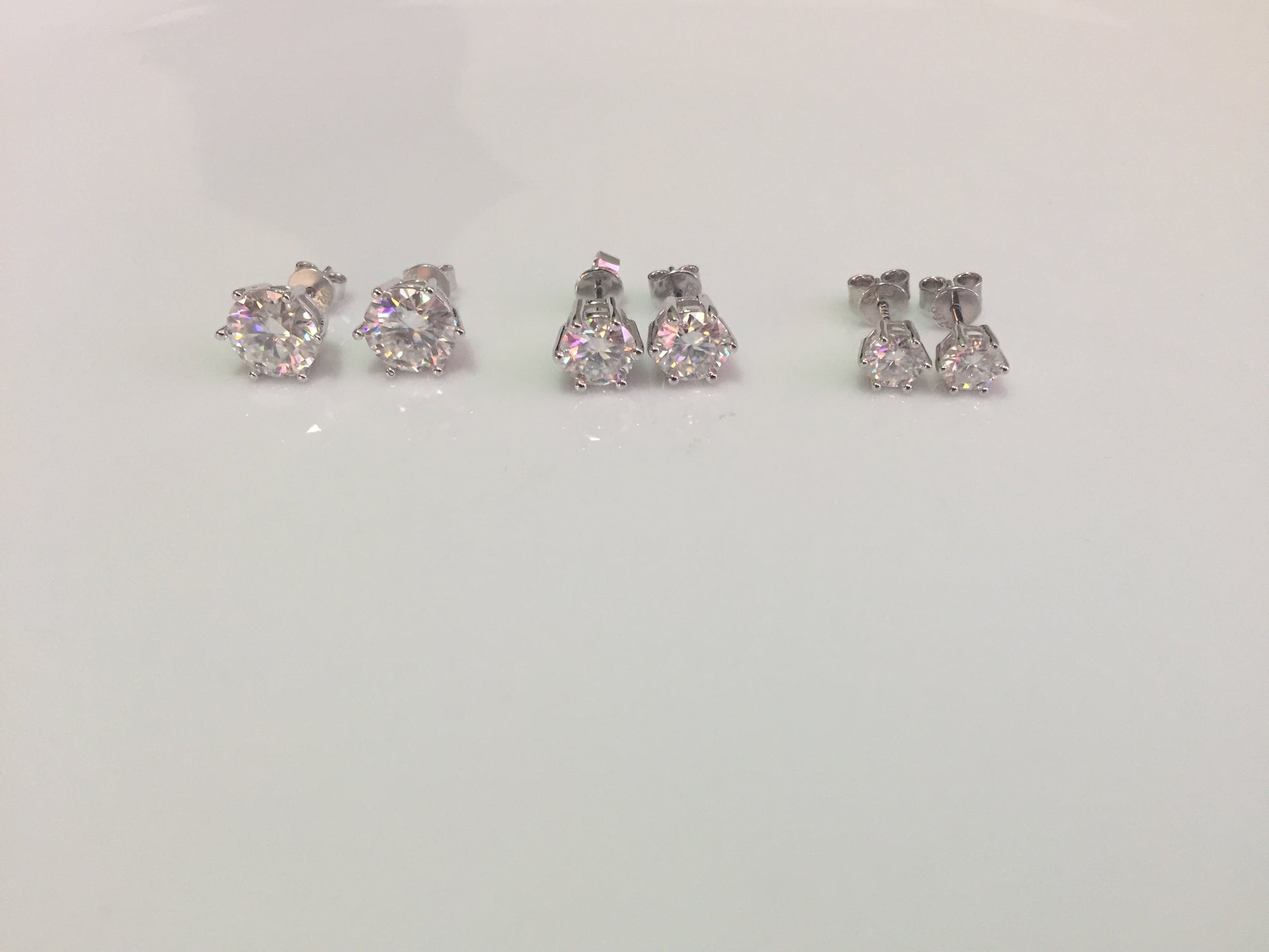 Sparkling Moissanite studs set in 925 Sterling Silver. 6 prong style with pushback closure. 3 sizes available: